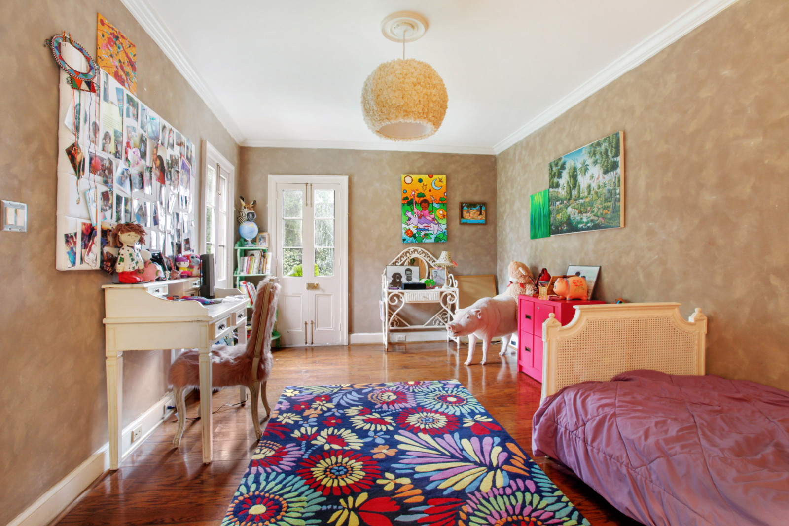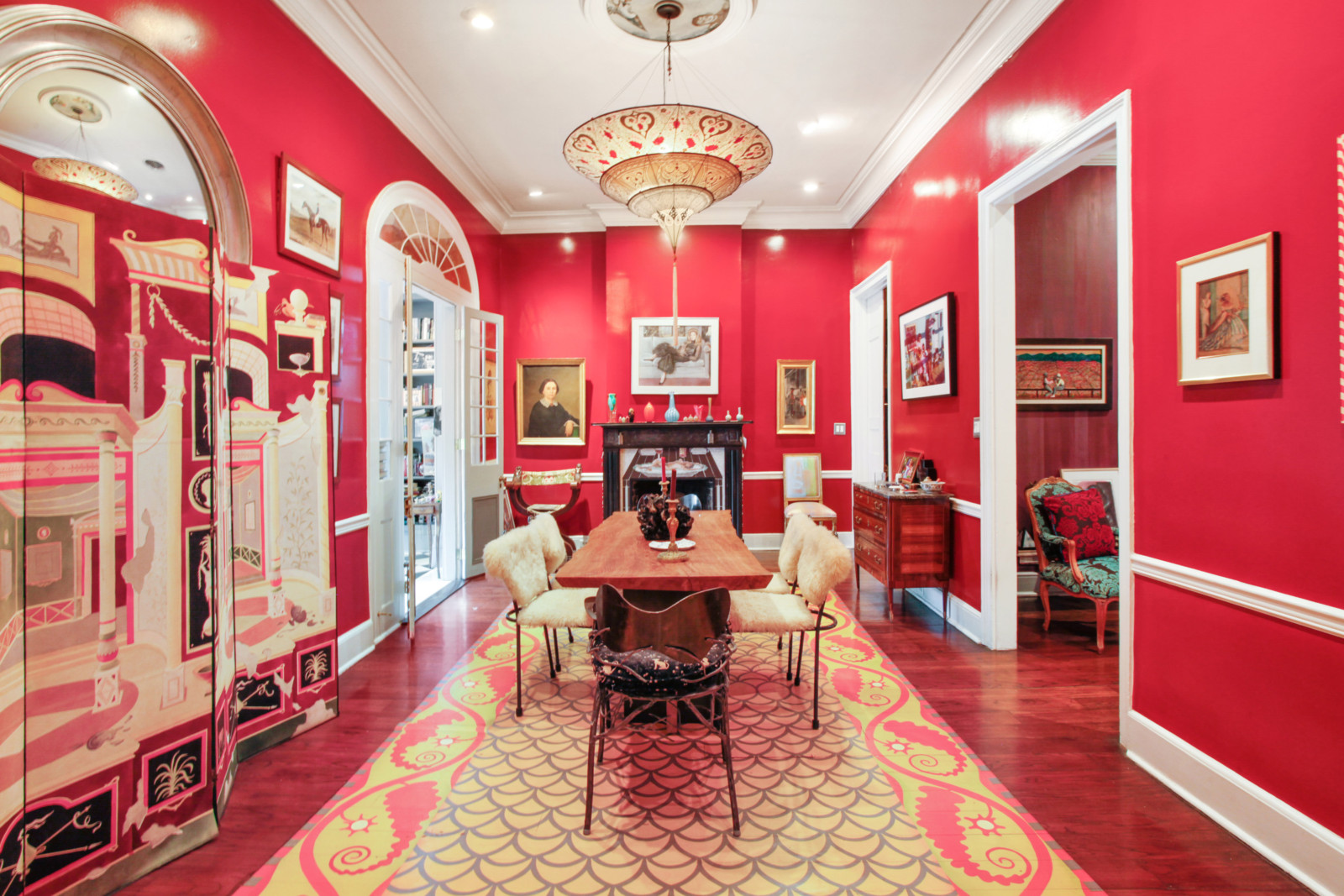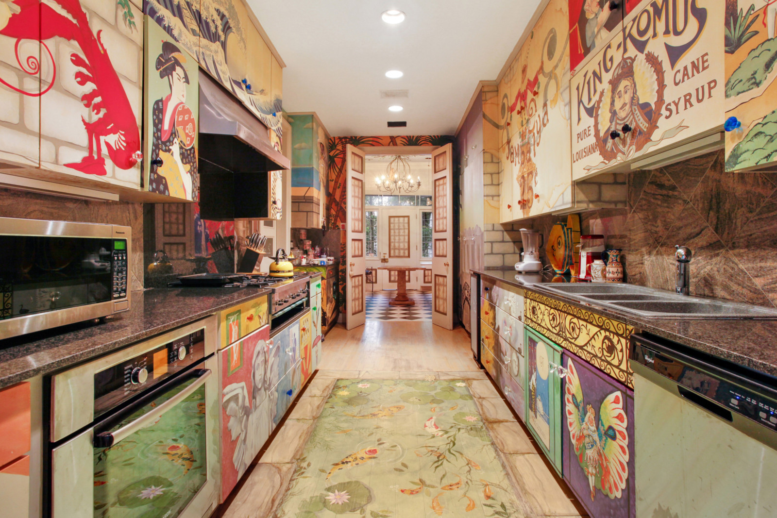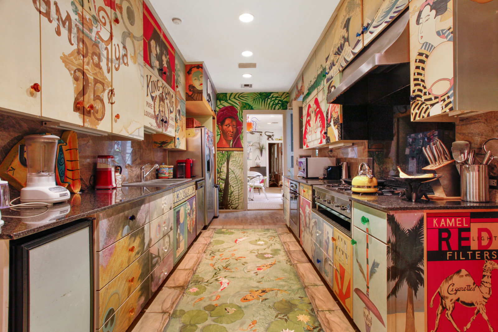 What makes this 1820 home so special are the colourful murals in a variety of styles, and the hand-painted cabinets, all by different artists. Let’s not forget the numerous pieces of artwork present in the home and those bold colours covering the walls. Apparently, the owner had, over a period of time, 27 different artists in the house painting. Not bad, uh?