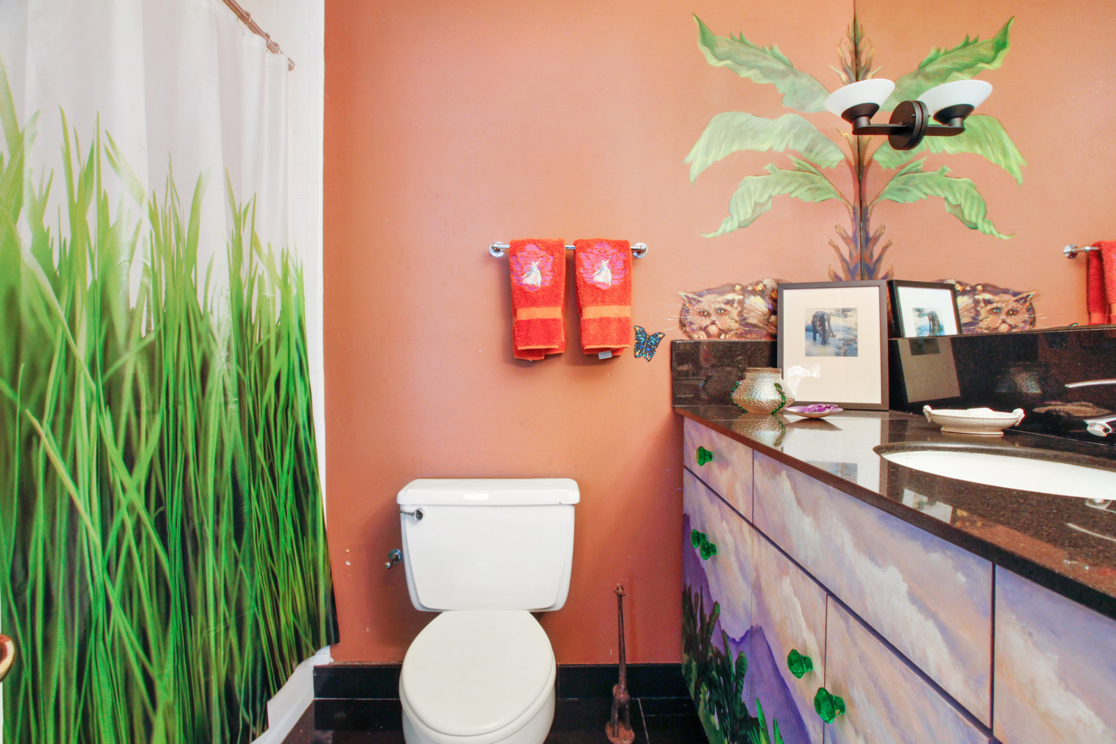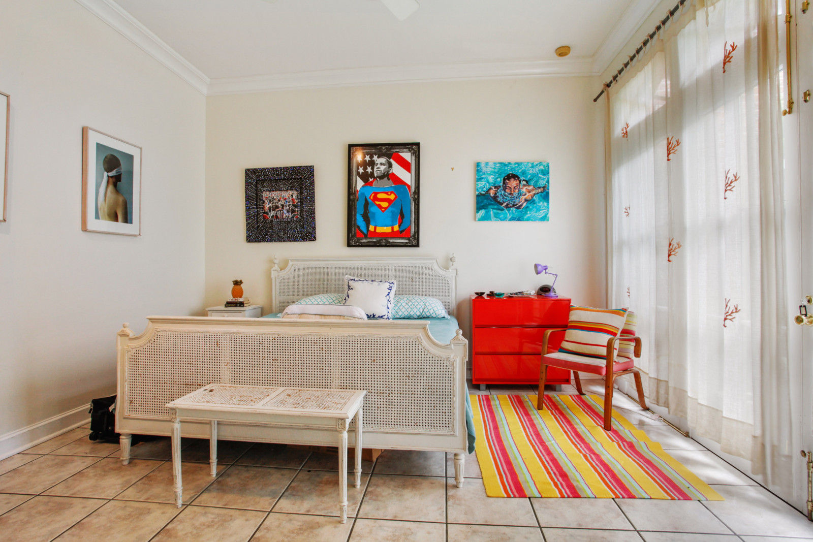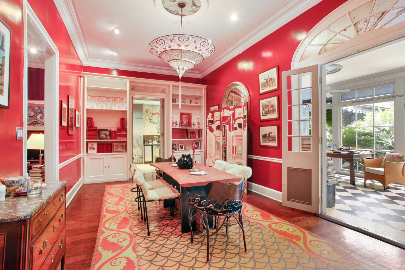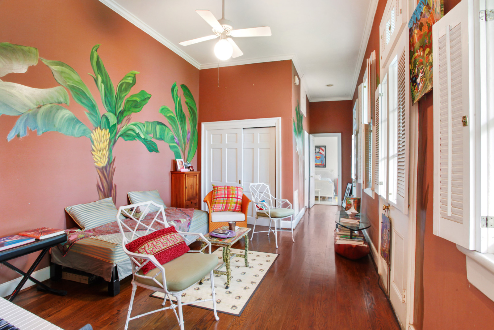 What makes this 1820 home so special are the colourful murals in a variety of styles, and the hand-painted cabinets, all by different artists. Let’s not forget the numerous pieces of artwork present in the home and those bold colours covering the walls. Apparently, the owner had, over a period of time, 27 different artists in the house painting. Not bad, uh?