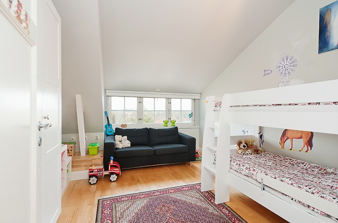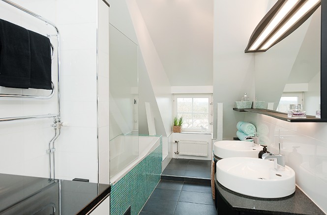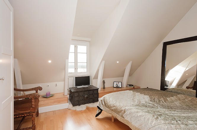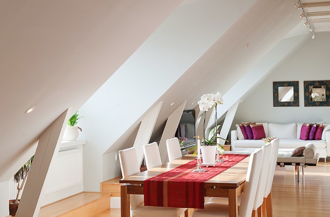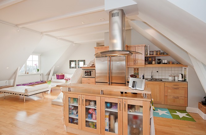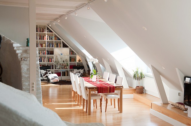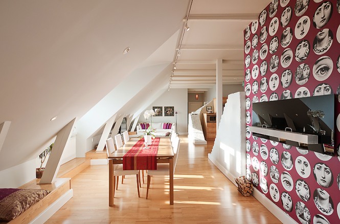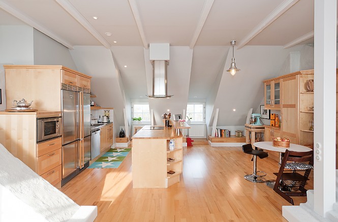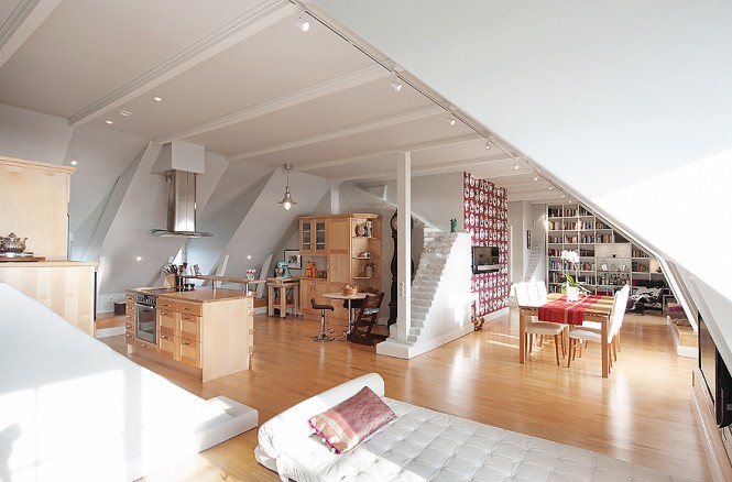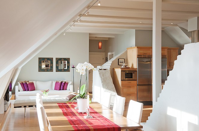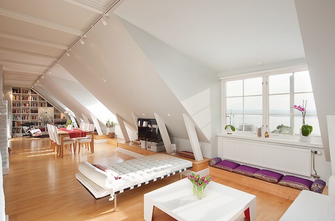 It’s bright, airy feel has us packing up our bags and ready to move in. We love all the light that comes in from the big windows and how the owners keep remnants of the old walls as low level dividers that disappear into the walls or off into the ceiling. This attic is definitely not your typical dark, dingy space.